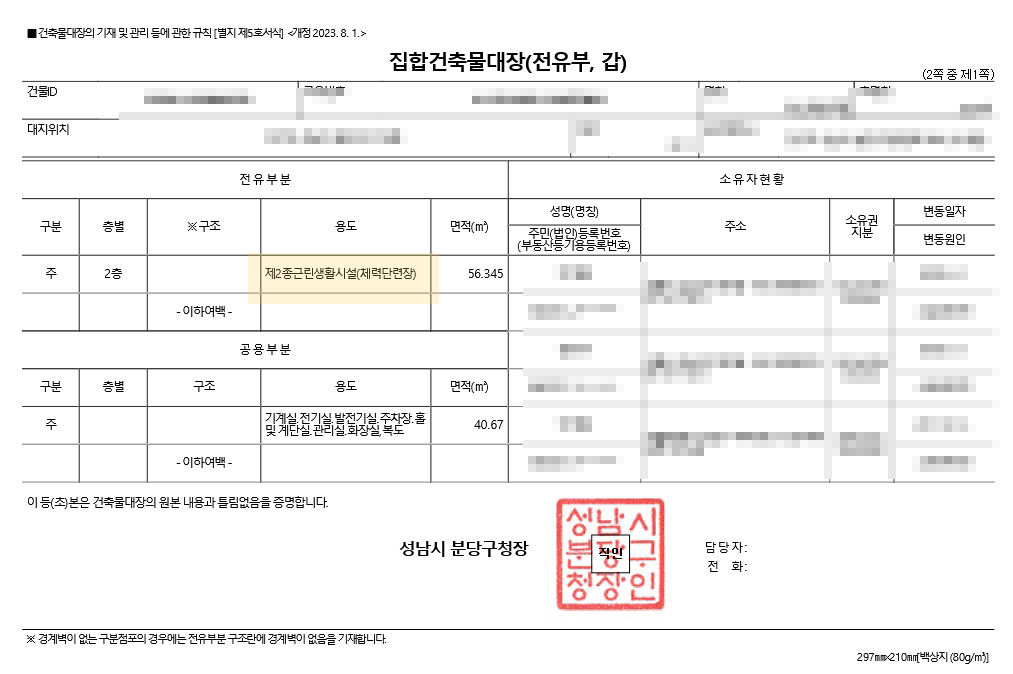 분당구 수내동의 교육연구 시설(학원)을 근린생활 시설(필라테스 센터)로 바꾸었습니다.